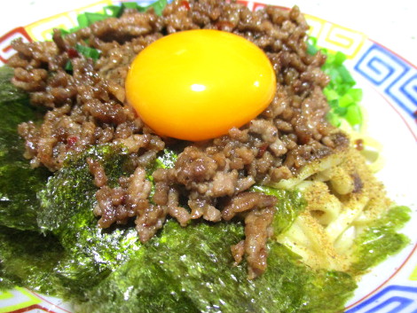 8 中華麺の上に、ニラ・青ネギ・海苔・魚粉を置き、台湾ミンチを載せ、卵黄をトッピングして出来上がりです。